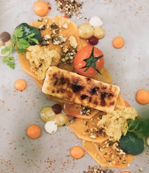 Smoked tofu |Tarragon nage | Sunflower seeds
